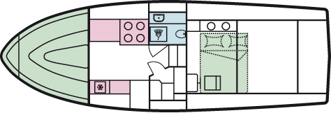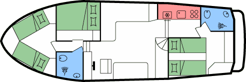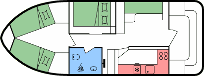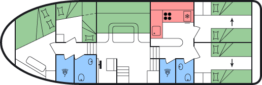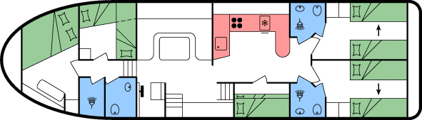 - Doppel- oder 2 Einzelbetten in den hinteren Kabinen