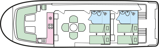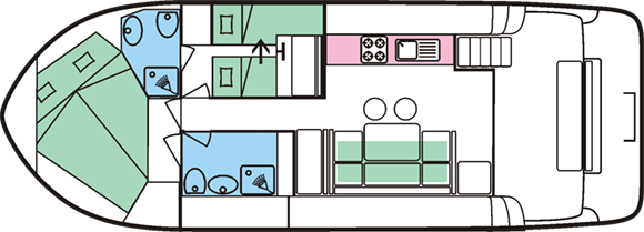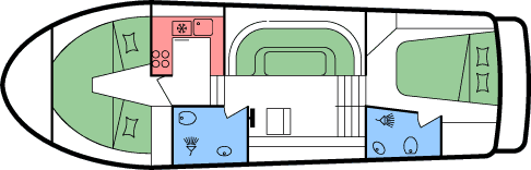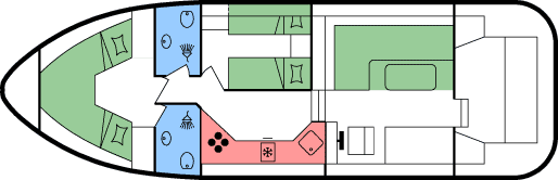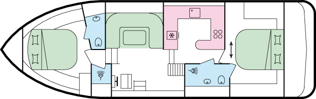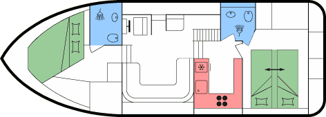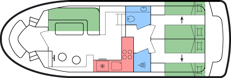 - Je 1 Doppel- oder 2 Einzekbetten in den beiden Heckkabinen